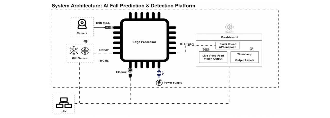To mitigate this challenge, the system fuses outputs from both the sensor and vision models using custom logic. When both streams align, the system confirms the prediction, significantly reducing false positives and ensuring caregivers receive high-fidelity alerts. All output data is displayed through an integrated monitoring dashboard that provides live video streams, real-time alerts, and visual indicators, enabling caregivers to monitor patients seamlessly and act immediately with confidence.